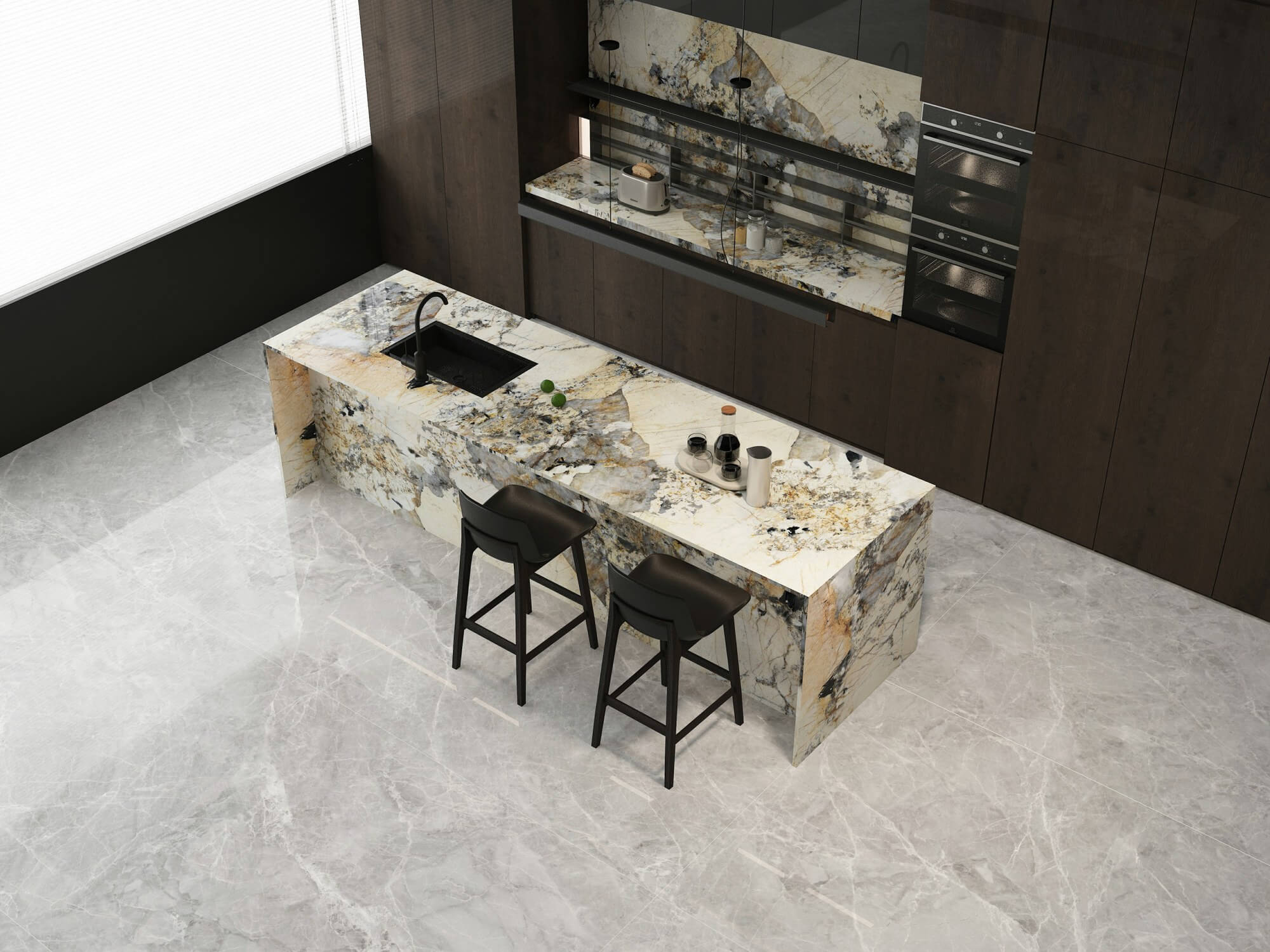 The Silk Finnish is characterised by an extremest;y matt, non-reflective surface, without any mirrored reflections. It is particularly soft to the touch, while still maintaining all the technical characteristics that made it perfect for kitchen worktops and furnishing elements. Used mainly for marble looks, it features the subtle irregularities typical in natural stone.